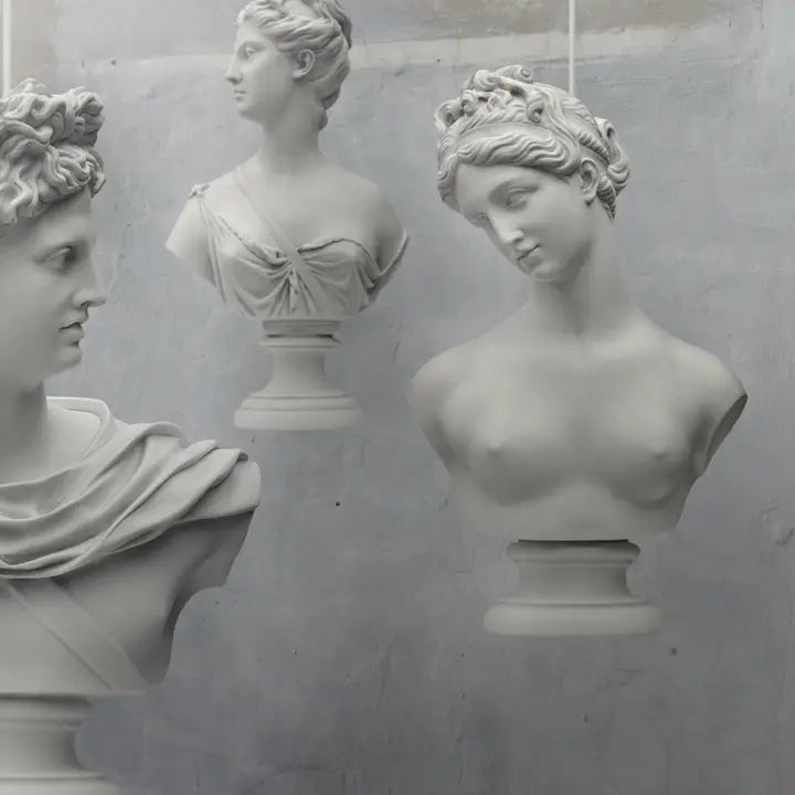 These pendant lights reappropriate Greek and Roman icons such as Apollo, Venus and Dianna. Cast with marble and stone dust they are perfect sculptures for both modern and traditional interiors, as an over counter or bar feature.